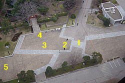 1橋跡 2厩側橋台跡 3桝形 4門跡 5厩跡 石垣や橋の位置を貼石で復元しています。 |